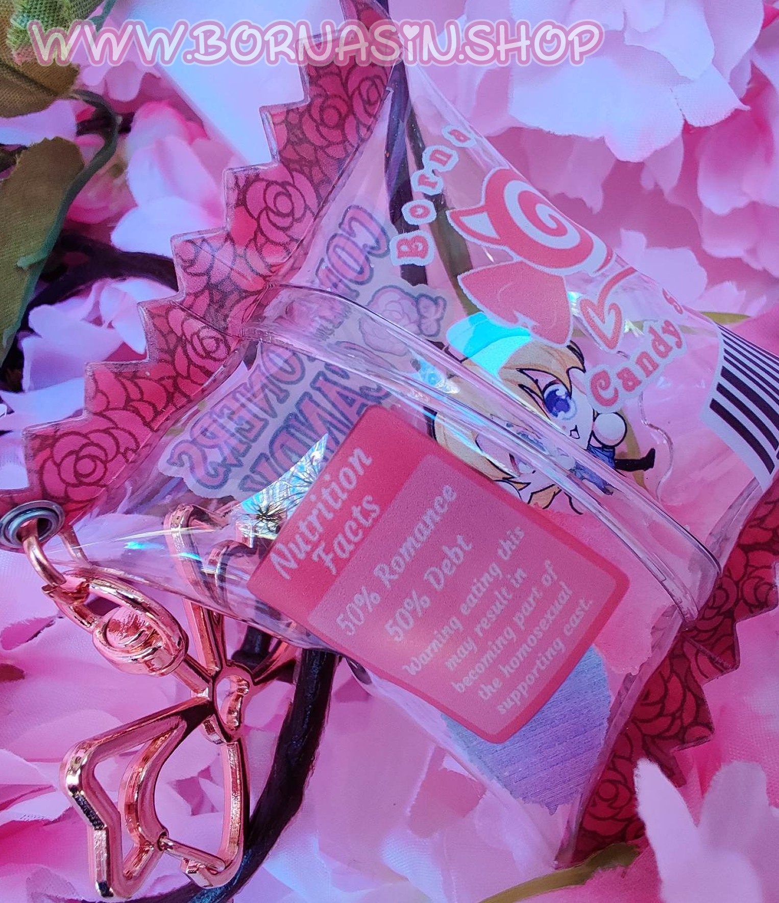 This charm is around 2 inches tall and is in a 3d PVC blown candy bag shape! Comes with matching clasp and gummies inside!